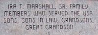 Ira Thomas Marshall, born in 1878, and his wife, Bertha, salute the 12 sons, grandsons, great grandsons, and sons-in-law who have served in World War II, Korea, the Gulf War, and Iraq: Tom Marshall Jr, Homer Marshall, Bill Marshall, Bob Marshall, Roy Coday, Bill Calvert, Howard Wilson, William R. Wilson, Richard Kent Wilson, Monte Shriver, Chris Mhoon, and Guy R. Swalm.