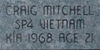 Specialist 4 Craig Mitchell served in the U.S. Army during the Vietnam War. At the age of 21, in 1968, Specialist Mitchell was killed in action (KIA) in Vietnam. His unit: 31st Engineering Battalion, 34th Engineering Group, 20th Engineering Brigade. Awards/citations: Purple Heart, National Defense Medal, Vietnam Service Medal, Republic of Vietnam Campaign Medal. He died outright in hostile fire, at Long Khanh Province, South Vietnam.
